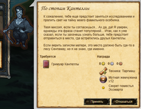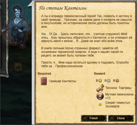 ВыполнениеИдём в Круг Наасаари в Лесу Сентамау и там выполняем одно из действий: Получив гримуар возвращаемся к Эссмарту. После сдачи Гриммуара Кантеллы идём в Крепость Эссмарта (F2) рассказывать секрет поместья Эссмарта.