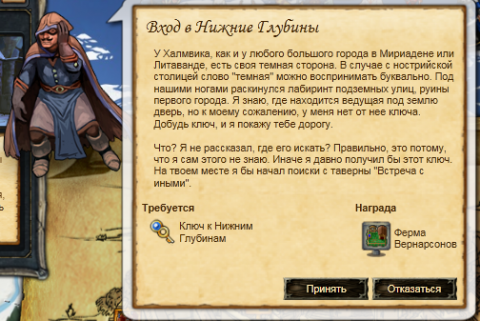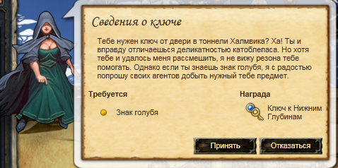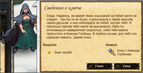 Возвращаемся к Эйоа Лливин в таверну "Встреча с иными" на Тракте Строителей, завершаем задание и получаем ключ. Подквест "Знак быка"Подквест "Бык?"Подквест "Знак кукушки"Подквест "Знак голубя"