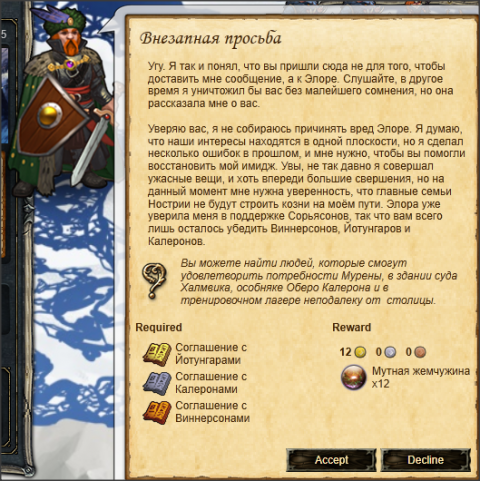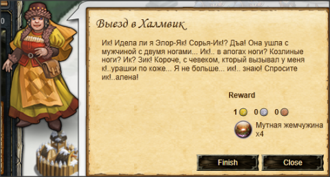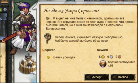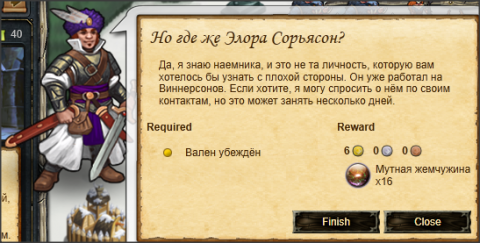 Отправляемся в Халмвик. Длинный хобрад. Таверна "Лебединая песня" и говорим с Мигалис Лойсон. Она сообщает, что Элора Сорьясон отправилась куда-то с неизвестным. О подробностях может сообщить Вален Виннерсон, Агент Виннерсонов, который находится в Длинном хобраде.