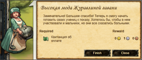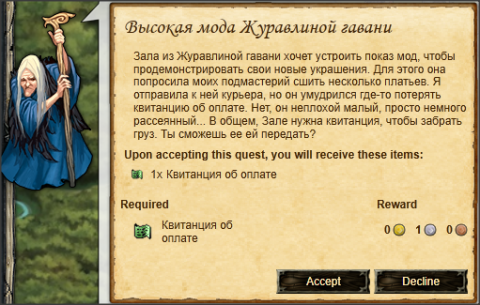 Омильра Гурэн просит Вас отнести Шаблон:Квитанция об оплате Зале в Журавлиную гавань, Оловянный ковш.