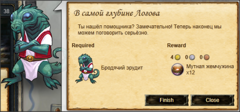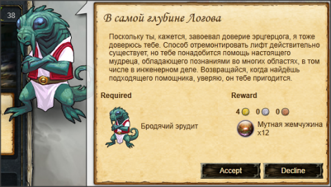 Бродячего эрудита в Таверне в Логове и сдайте квест. Для следующего квеста также возьмите в партию