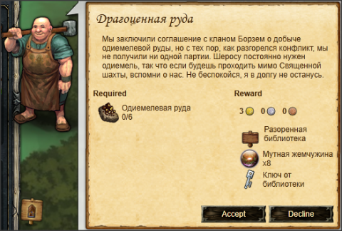 Взяв квест вам необходимо будет где-то достать Одиемелевая руда Одиемелевой руды. Ее можно накопать/взять в Священной шахте, но тамошние монстры весьма сильны, так что возможно будет легче купить ее на рынке.