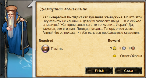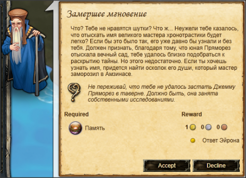 Завершив ритуал, вернитесь к Эйрону и сдайте квест. Теперь можете возвращаться к Джемме Пряморез в Факторию Энорвен и сдаем квест "Не то время"