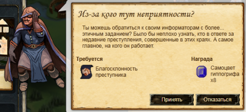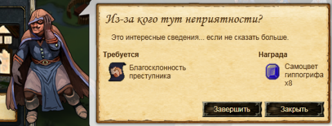 Из-за кого тут неприятности Шпионаж 0 Время 00:00:10 Усилие 0 6-10 × Самоцвет гиппогрифа Самоцвет гиппогрифа 2 × Благосклонность преступника Благосклонность преступника Время 16:12:00
