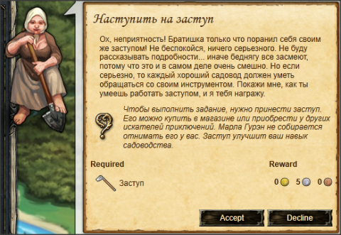 Для прохождения данного квеста необходимо приобрести в магазине Марлы Заступ и вернутся к ней для сдачи квеста.