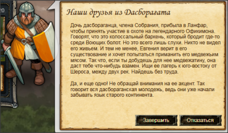 По этому квесту Роальд расскажет вам как найти Евгению, гостью и Дасборагана, которая приехала в Ланфар для охоты на легендарного баркеня Офикимона.