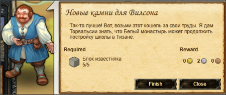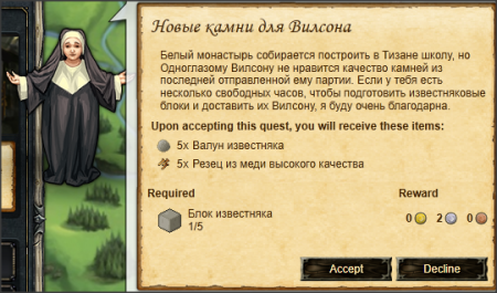 Начав это задание вы получите Валун известняка × 5 и Резец из меди высокого качества × 5 Находясь в Белом монастыре у Каменоломни у Отвесных скал можете их обработать в блоки.