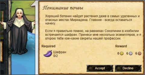 Амиша просит Вас принести ей Шафран, который можно добыть на Равнинах Соколинии. После добычи возвращайтесь к Амиши и сдавайте квест.