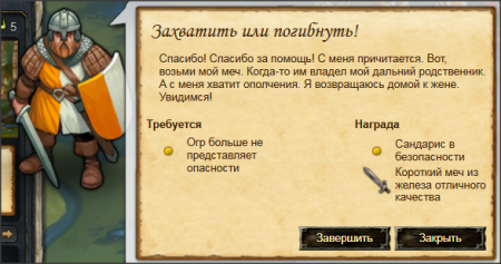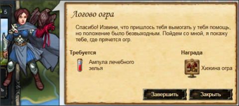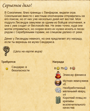 ВыполнениеМава просит вас найти Сандариса, который пошел охотиться на огра. Для этого придется пройти подквест "Логово огра" и "Захватить или погибнуть!"