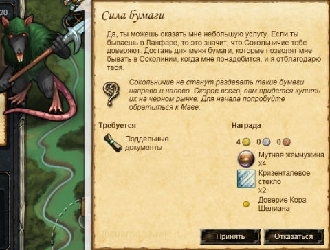 Кор Шелиан отправляет вас к Маве из Туристического района города Соколинии, она даёт подсказку о том, что бумаги может подделать Саход из Оазиса Сахода или кто-нибудь из Таверны "Ворон".