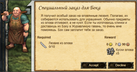 Слиток олова у вас остался от прошлого квеста и вы можете выковать из него лезвия тут же у