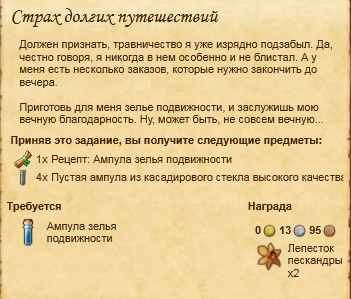 Полинепосум просит Вас изготовить для него Ампула зелья подвижности, для этого он выдает Вам Рецепт: Ампула зелья подвижности и Пустая ампула из касадирового стекла. Изготовить его можно там же в Городе Соколиния. Торговый район, Нюх Друида. После изготовления зелья возвращайтесь к Полинепосуму за наградой.