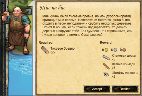 Бралмас просит Вас принести ему Тисовое бревно Тисовое бревно, который можно добыть там же в Лесу Бериус.