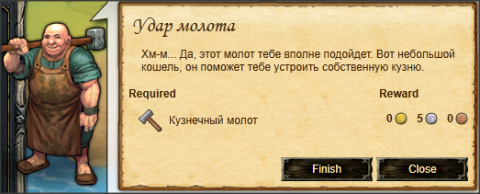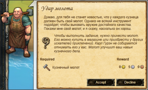 Для прохождения данного квеста необходимо приобрести в магазине Карла Гурэна Кузнечный молот и вернутся к нему для сдачи квеста.