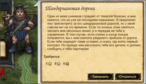 Один из моих учеников страдает от тяжелой болезни, и мне кажется, что он на последнем издыхании. Я предложил ему присмотреть за его шандериановой дорогой, но у меня совсем нет на это времени. Если ты хочешь этим заняться, заплати мне несколько монет, и я передам ее тебе в управление. В том случае, если ученик в конце концов поправится, вы с ним сможете разделить прибыль от дороги. Если тебе подходят такие условия, я скажу, где взять первый контракт. Но прежде чем рассказывать тебе все детали, я должен сообщить о тебе партнерам.